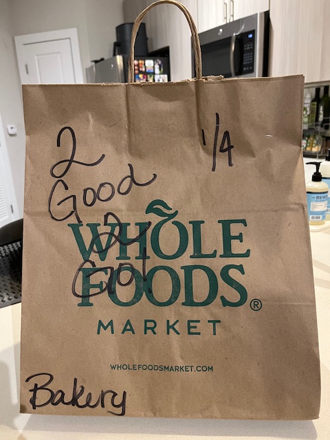 Too Good To Go partners with food businesses to offer bags of food that are still perfectly good to eat but because of sell-by dating cannot be sold in stores or restaurants the next day. Here’s an example of how it works: I’ll get a notification during the day that Whole Foods will have some bags from their bakery available that evening. I click on the TGTG app, reserve a bag and pay for it, and then Brett and I go pick it up in the evening. We never know what we’re going to get but every bakery bag we’ve bought so far has always contained high quality items, ones that are either at their sell-by date or the day after. I’m keeping my fingers crossed for a whole (even a half!) pie from the bakery one of these days, but so far we’ve gotten bagels, cookies, brownies, turnovers, scones, muffins, coffee cake, and other great bakery items. The value of every bag or box we’ve purchased has been worth at least three times what we’ve paid for it.
