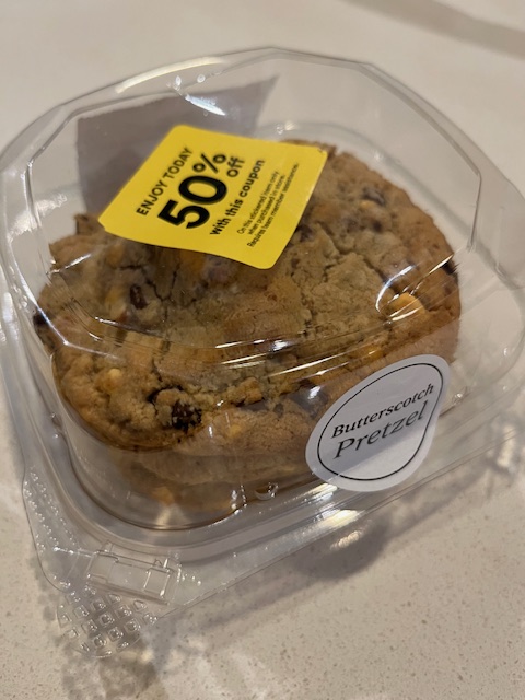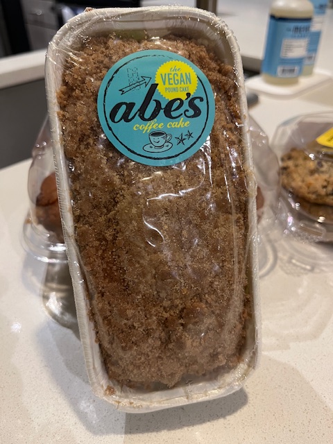 A third TooGoodToGo bag this month was from the Whole Foods bakery for $6.99. It contained four giant pretzel butterscotch cookies (value: $6.49), four large orange cranberry muffins (value: $7.49), and an Abe’s vegan coffee cake (value: $8.99).