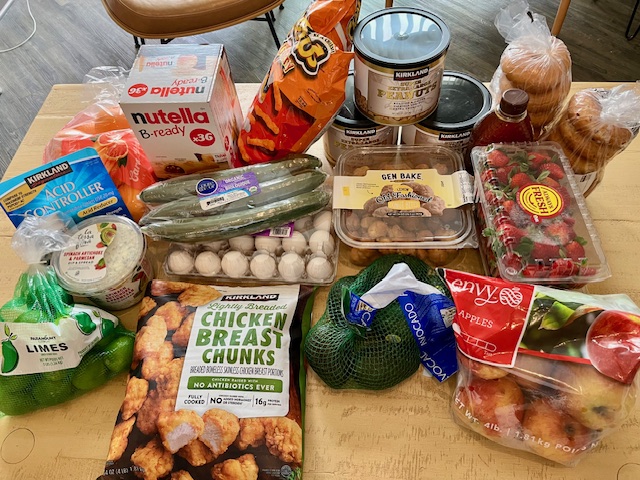 COSTCO was our first stop as it’s the store furthest away from home. We start our shopping with a visit to the ATM, where we withdraw $300. Total amount spent this month at Costco: $153.08. Some things we buy every month, other just now and again or because we want to try them. The honey (for Brett), the dip (which really does elevate tuna salad to a new level), the chicken nuggets, and the lemon donut holes were “extras” this month. Brett favorite daily snack is peanuts (around a 1/2 cup) so we always buy three cans. Strawberries were just $2.59 for a two pound-container so we bought two of those – our granddaughter loves them after school and Brett and I will enjoy some strawberry shortcake. We also picked up eggs, more fruit, avocados, cucumbers, bagels (orange-cranberry – delicious!), some medication, and Cheetos and Nutella bars for afterschool snacks for our granddaughter. One thing we decided not to buy was coffee! It’s just gotten too expensive and we made a switch to green tea this month (which we already had on hand). Brett gets a cup of coffee every day down in the lobby but otherwise it hasn’t been missed.