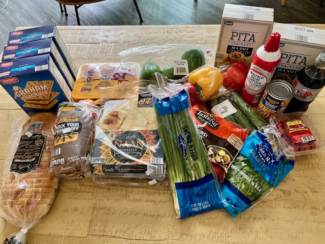 Our next stop was ALDI. Total amount spent: $57.83. I always check out their produce as they have good prices for things we need now and then and we got green onions, cilantro, peppers, zucchini, cherry tomatoes, and some small potatoes this trip. We always buy two packages of naan bread here every month for pizzas but decided to add a loaf of their wheat bread and a loaf of sliced sourdough as well as they cost less than Trader Joe’s. We eat graham crackers a lot (I like to make that yogurt and graham cracker “cheesecake”) and three boxes is the right amount to get through the month. The chicken is for masala, the crackers to go with the dip not used in tuna sandwiches, the can of beans is for a salad, the whipped cream for strawberry shortcakes, and the bottle of Diet Coke is a once-a-month treat for me.