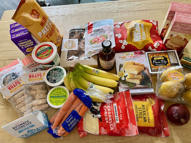 Our last stop was TRADER JOE’S as it’s on our way home from Costco and Aldi. Total spent: $107.56. What we buy at TJ’s depends somewhat on what is necessary but also on how much money we have left out of our $300. Honey mangoes were the treat for me this trip – I love them! Other produce we picked up was carrots, bananas, and a red onion. Another treat for us was the sour cream donuts. We also bought two packages of grated cheese (for pizzas), barbecue sauce, macaroni and cheese, two types of cream cheese for our bagels, two packages of butter, and a container of yogurt. The artificial crab (surimi) was for California roll salad, and the tofu for a CoodDo stir fry. We bought more snacks for our granddaughter (pretzels and popcorn), and she likes their mochi cake (Hawaiian butter mochi) too so we picked up a box of that to make as well as some of their Meyer lemon bread mixes to make during the month. Dog treats are always a must buy as is toilet paper, and we’re going to give their dishwasher detergent a try this month. (The package of toilet paper is missing from the photo.)